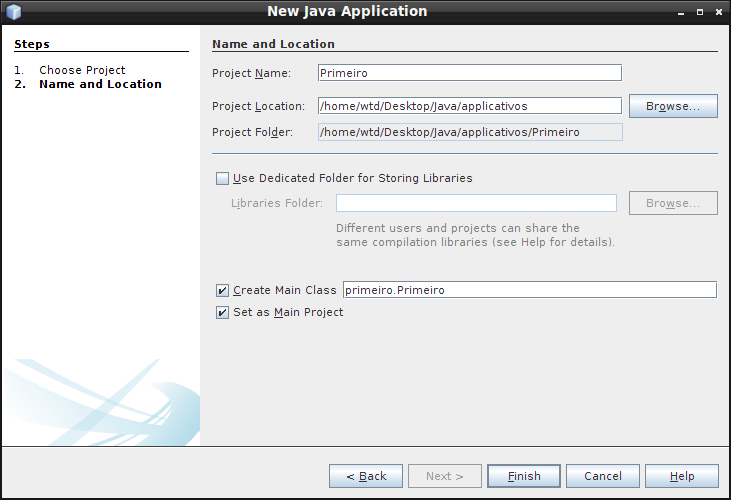 Em 'Project Location' ficará a pasta onde ficará guardado seus projetos. Então escolha um lugar fácil e bacana também. Crie um local se precisar. Clique em Finish.