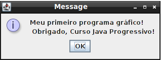 JOptionPane.showMessageDialog(null,"Meu primeiro programa gráfico!\n Obrigado, Curso Java Progressivo!");
